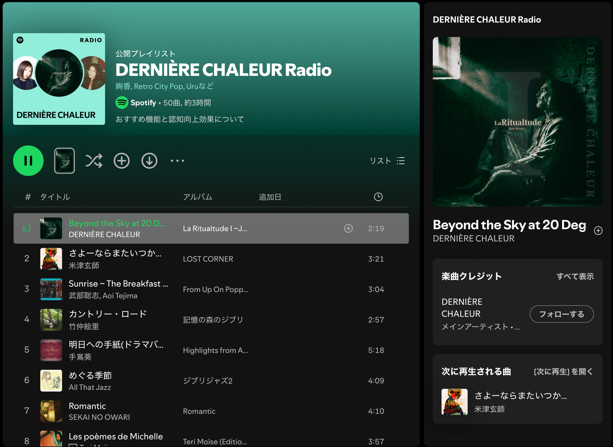 単なるランダムな選曲ではなく、Dernière Chaleurの楽曲を軸として、その世界観に共鳴するトップアーティストたちの楽曲がミックスされた「公式レコメンド番組」のような存在です。